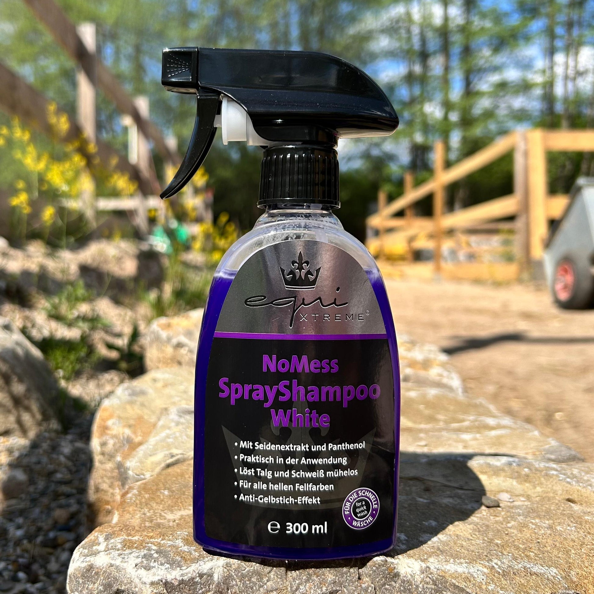 TheequiXTREME NoMess SprayShampoo Whitemakes grooming light-colored horses child's play. Specially developed for the needs of sensitive horse skin, this shampoo effortlessly removes sebum, sweat, and stubborn stains – even from manure, grass, and urine. The unique purple formula ensures a radiantly clean result and leaves your horse radiant.