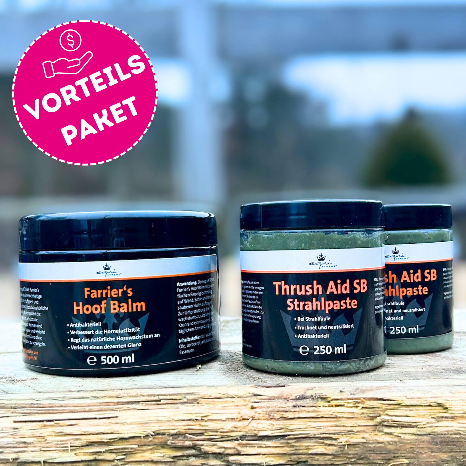 Das Bundle besteht aus 2x Thrush Aid Strahlpaste 250ml und 1x Farrier‘s Hoof Balm 500ml